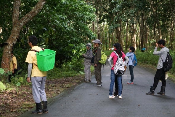 15日开始就分不同的课题小组活动了。学生被分成8个小组:分别是勐仑地区两栖爬行类动物多样性调查、热带植物特有生态学性调查、西双版纳勐仑地区昆虫多样性调查、西双版纳植物园及巴卡小寨大型真菌多样性调查、勐仑植物园雀形目小型鸟类的行为观察、勐仑地区底栖动物资源调查、古茶山生境及其茶叶品质特点探秘。betway必威官方网站学生分别参加了西双版纳勐仑地区昆虫多样性调查、西双版纳植物园及巴卡小寨大型真菌多样性调查、及古茶山生境及其茶叶品质特点探秘四个小组的实习活动。同学们的工作很辛苦,也非常的有意义。“观鸟组”同学一大早6点钟就进园子了,坐在那里一动也不动用望远镜观察,记录一种采食花蜜的小鸟;“昆虫组”及“两爬组”则是要到晚上十一、二点、观察昆虫传粉的同学则是在中午最热的一、二点钟;“真菌组”同学则要去那些湿漉漉的林下寻找各种各样的蘑菇,晚上还要在解剖镜和显微镜下观察记录;“茶组”同学每天坐车去各个茶园进行探秘。大家很充实的过着每一天,也非常珍惜这样的实习机会。云南大学的指导老师每天和实习同学共同作息,对同学们的工作进行各方面的指导。