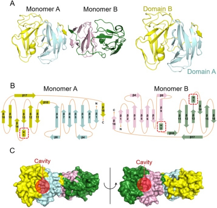 首先,团队通过X射线衍射解析了伪狂犬病毒dUTPase的2.23 Å高分辨晶体结构,阐明dUTPase以果冻卷基序形成的β桶二聚体的形式存在,两种单体的结构表现出高度的相似性,但在它们的二级结构中可以观察到细微的差异。利用静态光散射和小角衍射分析,证实了二聚体在溶液中的稳定性。同时根据其结构信息,在每个单体中存在一个空腔,根据空腔的结构及其与底物dUMP的相互作用,可以合理地将其视为PRV dUTP酶的活性中心(图1)。