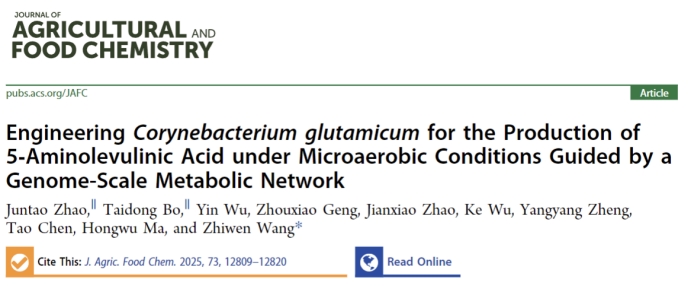 5-氨基乙酰丙酸(5-ALA)作为血红素、维生素B12等重要生物分子的前体,在医药和农业等领域具有重要应用。利用代谢工程与合成生物技术合成5-ALA成为重要的研究热点。近日,宁夏大学/天津大学王智文团队在农业和食品化学领域期刊《Journal of Agriculture and Food Chemistry》(一区TOP,2024 IF:5.7)上发表封面论文,基于基因组尺度网络模型模拟分析了不同溶氧条件下谷氨酸棒杆菌合成5-ALA的最优代谢通量分布,结合代谢工程首次实现了谷氨酸棒杆菌微好氧条件下5-ALA的生物合成。