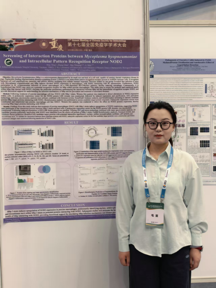 毛苗同学的墙报展示“Screening of Interaction Proteins betweenMycoplasma hyopneumoniaeand Intracellular Pattern Recognition Receptor NOD2”吸引了众多与会者的目光。