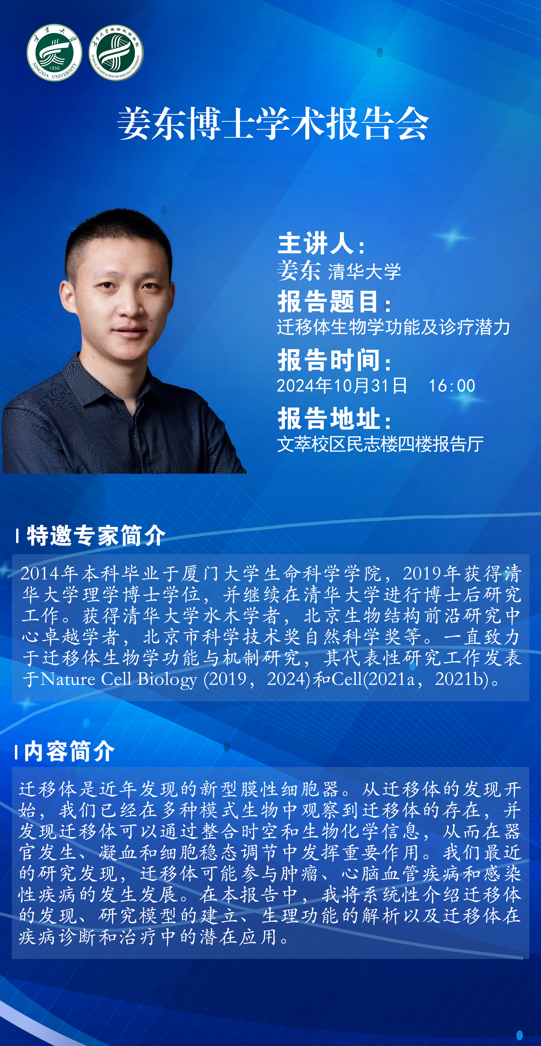 姜东2014年本科毕业于厦门大学生命科学学院,2019年获得清华大学理学博士学位,并继续在清华大学进行博士后研究工作。获得清华大学水木学者,北京生物结构前沿研究中心卓越学者,北京市科学技术奖自然科学奖等。姜东一直致力于迁移体生物学功能与机制研究,其代表性研究工作发表于NatureCellBiology(2019,2024)和Cell(2021a,2021b)。