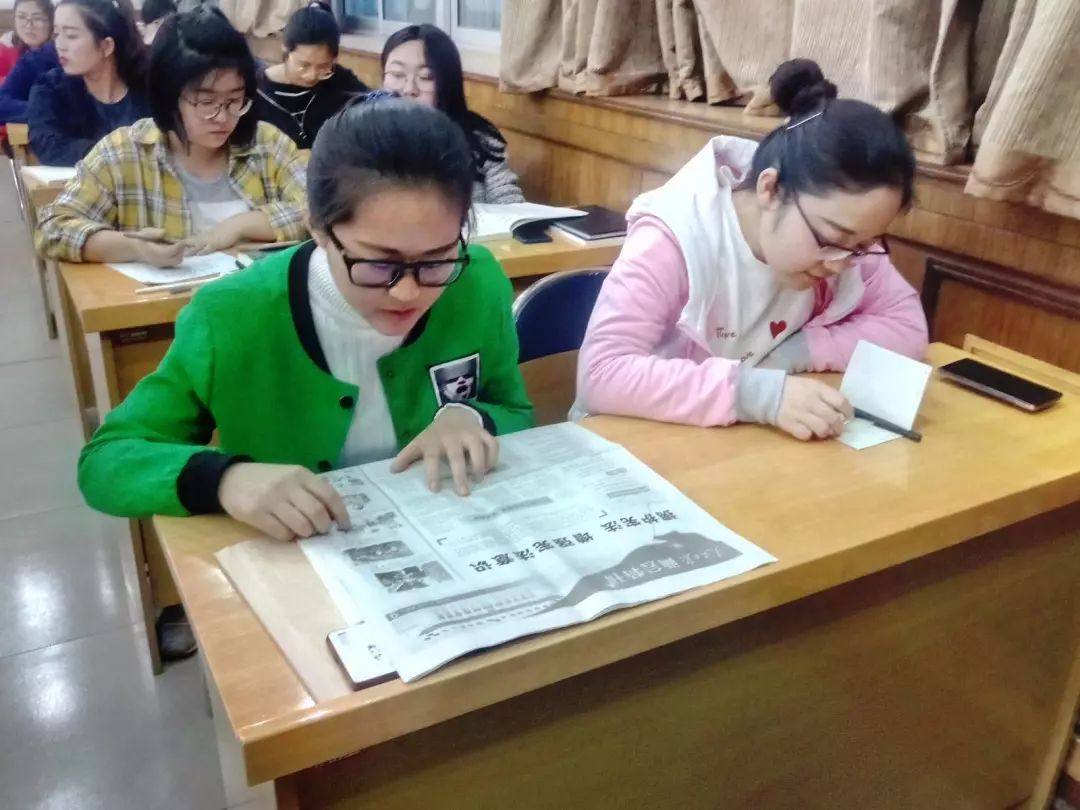 学习开始之前马晓莹同学说明了本次学习的要求和需要掌握的内容。接下来,大家通过接龙的方法阅读报刊,声音洪亮,吐字清晰,保证每一个同学都能清晰的听清并学习两会内容。大家热情高涨,对本次内容抱以积极的态度,表示希望紧跟时代步伐,了解新的制度和法规。