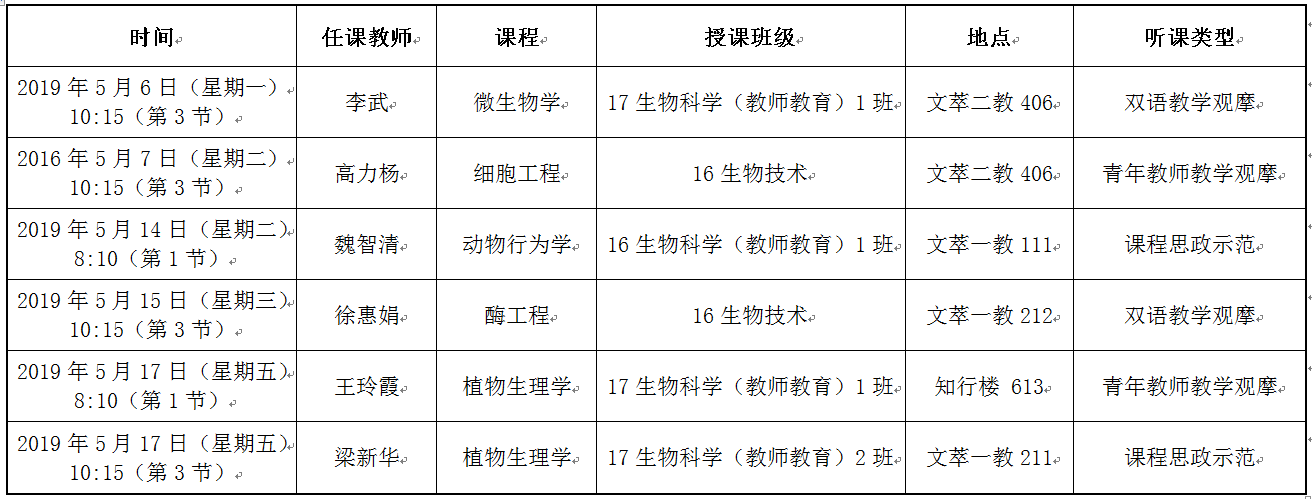 生命科学学院2018-2019学年第二学期期中教学检查听课安排