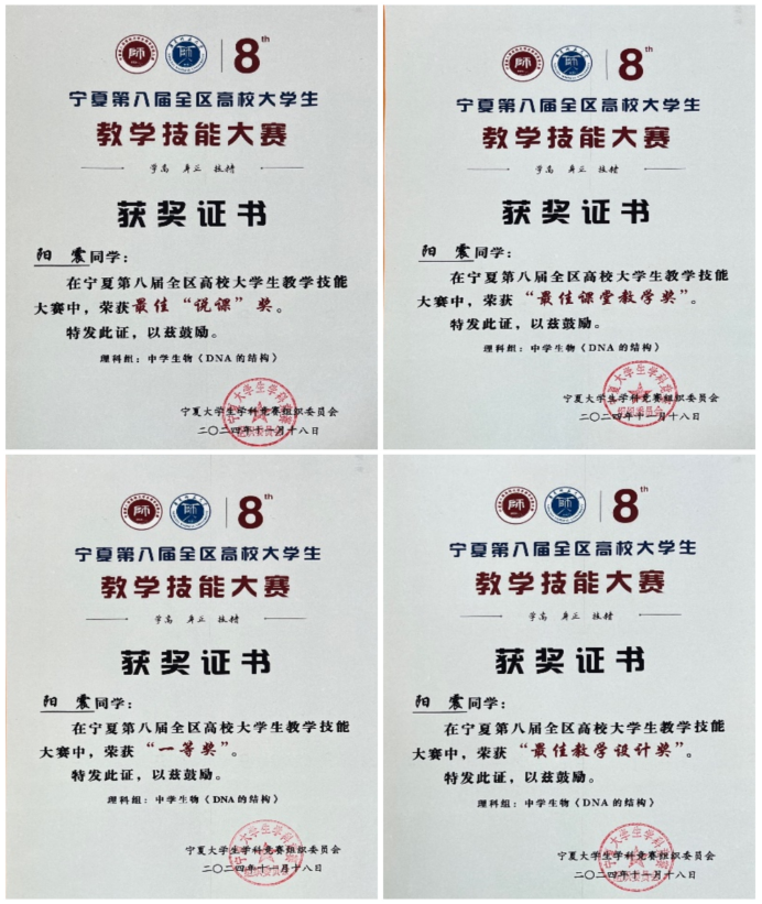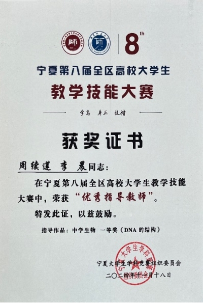 2024年11月16日至17日,由宁夏教育厅主办、宁夏师范大学承办的第八届全区高校大学生教学技能大赛决赛在宁夏师范大学古雁校区举行。来自宁夏大学、北方民族大学、宁夏医科大学等18所高校的199名学生入围决赛。betway必威官方网站2021级生物科学(师范)专业本科生阳震在此次比赛中表现卓越,荣获理科组(中学生物)一等奖,并斩获“最佳教学设计奖”“最佳说课奖”“最佳课堂教学奖”三个单项奖。同时,betway必威官方网站师范教育教研室周续莲老师、李晨老师荣获“优秀指导教师”奖。