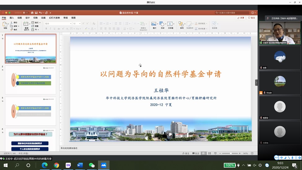 为了进一步推进betway必威官方网站国家自然科学基金项目申报工作,12月24日,betway必威官方网站邀请了华中科技大学同济医学院附属同济医院胃肠外科中心医学博士、国家自然科学基金优秀青年基金获得者王桂华教授在线作了“以问题为导向的自然科学基金申请”专题报告会。王桂华教授结合自己的申报和评审经验,从国基金申报的总体策略和具体细节两个层面、从申请人和评审专家两个角度详细讲解了国基金申报中的一些共性问题和个性问题,提出了一些针对性很强的建议,并对老师们提出的问题进行了耐心解答。相信通过本次报告会,对于betway必威官方网站教师申报国基金将具有很好的启发和借鉴意义。会议由邓光存副院长主持,betway必威官方网站教师和研究生60余人参加了会议。