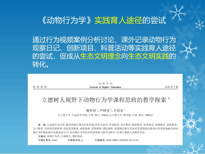 教师团队由6人组成。魏智清主持研究。生命科学学院书记沈岩东为课程共建人,负责把关课程思政与思政课程同向同行。杨贵军教授负责行为案例选编。杨涓教授负责行为生态学、保护行为学案例选编。赵红雪教授负责思政元素梳理。张东涛教授负责解释行为的生理机制。