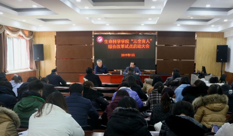 1月16日下午,生命科学学院“三全育人”综合改革试点启动会议在文萃校区知本楼二楼报告厅召开。学院领导和全院老师及学生代表参加。
