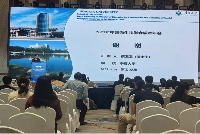 在为期三天的会议里,大咖云集,内容精彩纷呈。团队成员认真聆听众多学术巨擘带来的前沿学术报告,汲取最新研究成果和创新理念。会议设置多个分会场,涵盖微生物学的各个研究方向,为大家提供深入交流和探讨的空间。此外,年会还安排了丰富的墙报展示环节,展示微生物领域的最新科研进展和创新成果,团队成员在墙报展示环节积极交流,碰撞思想的火花。博士生蔡卫卫作为“病原微生物与健康”分会场的唯一一名在读博士研究生作题为《Metagenomic analysis of antibiotic resistance genes in the wastewater treatment system of Yinchuan City: The prevalence and spread of these genes in water and the mouse gut microbiota》的口头汇报,系统介绍了在“全健康(One Health)”理念框架下,本团队基于宏基因组检测技术的宁夏银川市污水系统中病原微生物与耐药基因分布与传播机制的研究进展,引发多位同行的关注与热烈讨论。团队其他参会成员也积极通过墙报交流展示了相关研究成果,不少参会者被团队的研究成果所吸引,驻足交流。
