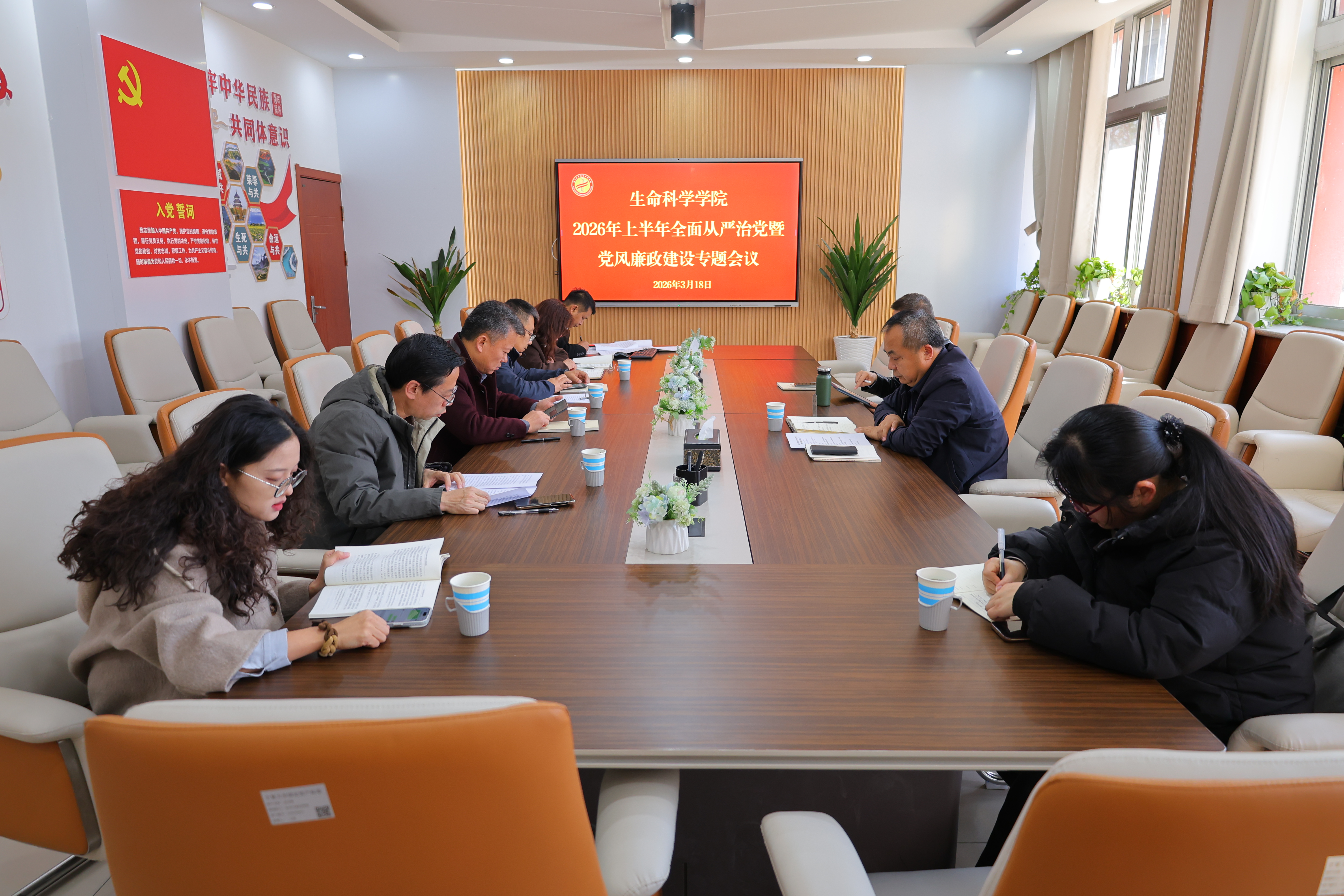 为深入学习贯彻习近平新时代中国特色社会主义思想,落实二十届中央纪委五次全会、自治区第十三届纪委五次全会精神,推进全面从严治党向纵深发展,引导党员干部践行正确政绩观,3月18日,生命科学学院召开2026年上半年全面从严治党暨党风廉政建设专题会,同步启动树立和践行正确政绩观学习教育读书班。学院领导班子、党总支委员及各党支部书记参会,会议由学院党总支书记邓光存主持。